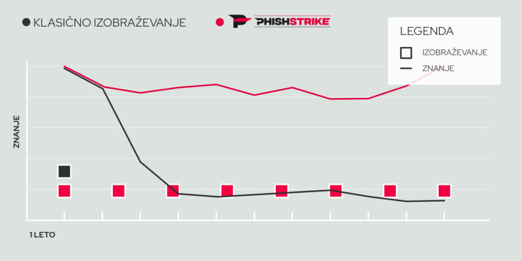 Večina podjetij se izobraževanja loti enkrat letno – običajno prek predavanja ali splošnega spletnega tečaja. A varnostna znanja hitro zbledijo. Ko zaposleni niso redno izpostavljeni primerom napadov, rutini in opozorilom, pozabijo, kaj je sumljivo in kaj je normalno. Hkrati se grožnje izjemno hitro spreminjajo; napadi, ki so bili učinkoviti pred pol leta, so danes bistveno bolj prefinjeni.